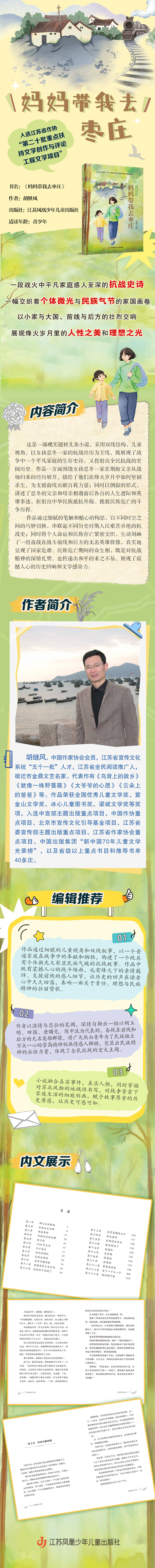 胡继风,中国作家协会会员,江苏省宣传文化系统“五个一批”人才,江苏省全民阅读推广人,宿迁市金鼎文艺名家。代表作有《鸟背上的故乡》《就像一株野蔷薇》《太爷爷的心愿》《云朵上的爸爸》等。作品荣获全国优秀儿童文学奖、紫金山文学奖、冰心儿童图书奖、梁斌文学奖等奖项,入选中宣部主题出版重点项目、中国作协重点项目、北京市宣传文化引导基金项目、江苏省委宣传部主题出版重点项目、江苏省作家协会重点项目、中国出版集团“新中国70年儿童文学光荣榜”,以及省级以上重点书目和推荐书单40多次。