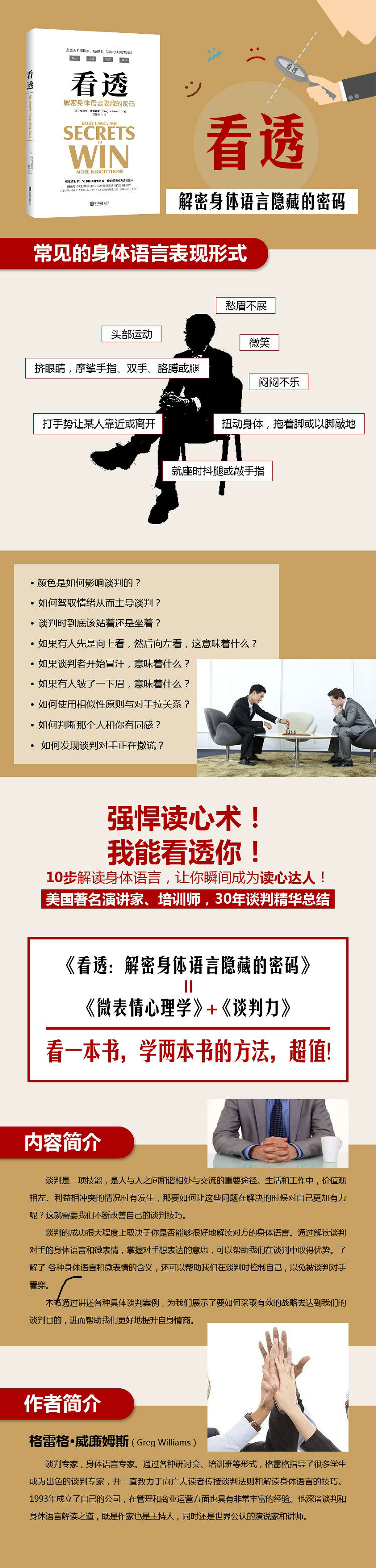 《看透:解密身体语言隐藏的密码》中的案例人物表现出了惊人的洞察力,并展示了身体语言、微表情和情商是如何影响谈判结果的。本书不仅教会你解读非语言信息,也会助你发掘多门实用利器,这样就能将无声的线索转化为谈判桌上的优势。