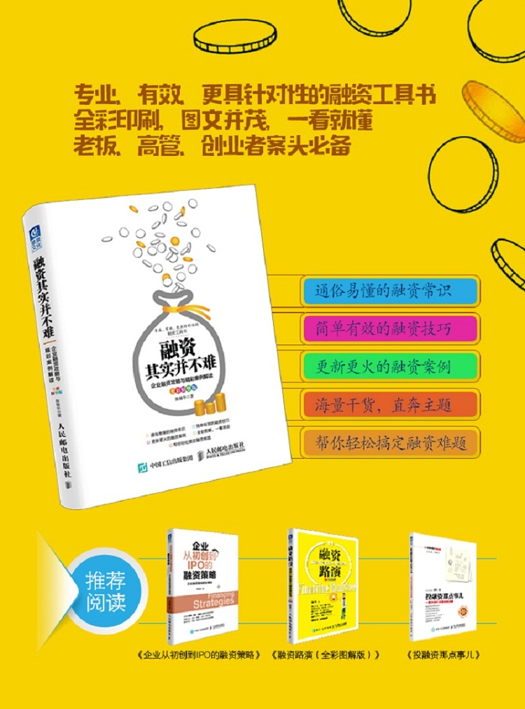 本书分上下两篇。上篇涉及企业融资必知必会的专业知识,包括融资的基本常识、融资的常见方式、商业计划书的细节、投资者青睐的企业特点、融资谈判、融资涉及的法律知识等。所有这些,都是企业在正式融资之前需要了解的。掌握了这些知识,融资才能做到有的放矢。下篇涉及融资必须熟知的成功企业案例,包括这些企业的创业故事、融资历程、方法技巧、成功经验等,助力读者学习典范,努力寻求适合自身企业特点的融资方案。可以说,本书集知识性、专业性、故事性、趣味性于一体,图文并茂,通俗易懂,非常适合企业老板、高管及创业者阅读。