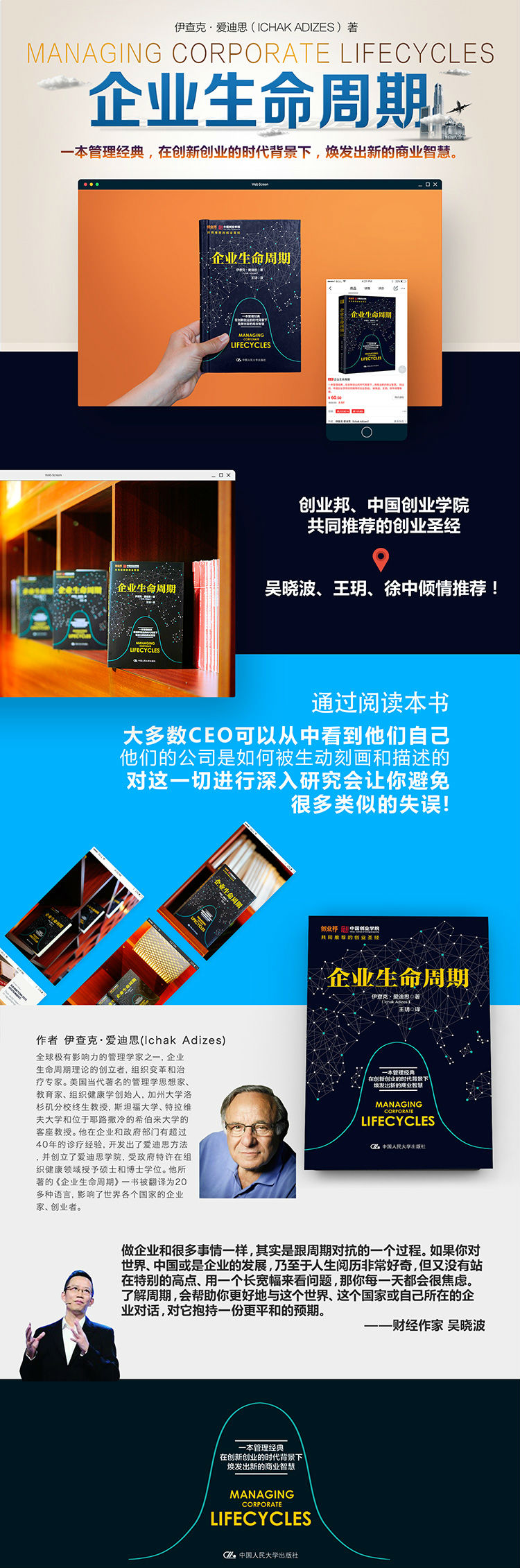 伊查克·爱迪思(Ichak Adizes),全球*有影响力的管理学家之一,企业生命周期理论的创立者,组织变革和治疗专家。美国当代著名的管理学思想家、教育家、组织健康学创始人,加州大学洛杉矶分校终生教授,斯坦福大学、特拉维夫大学和位于耶路撒冷的希伯来大学的客座教授。他在企业和政府部门有超过40年的诊疗经验,开发出了爱迪思方法,并创立了爱迪思学院,受政府特许在组织健康领域授予硕士和博士学位。他所著的《企业生命周期》一书被翻译为20多种语言,影响了世界各个国家的企业家、创业者。