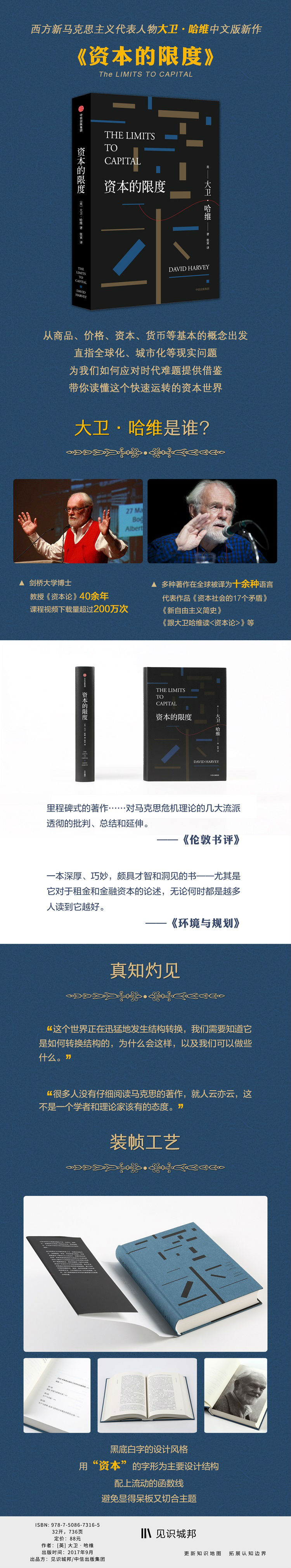 剑桥大学博士,现为纽约市立大学(CUNY)研究生院杰出教授,全球作品被引用数量领先的人文学者。哈维教授《资本论》40余年,其课程视频下载量超过200万次;其著作在全球被译为十余种语言,已译为中文的有《资本社会的17个矛盾》《新自由主义简史》《跟大卫哈维读》等。