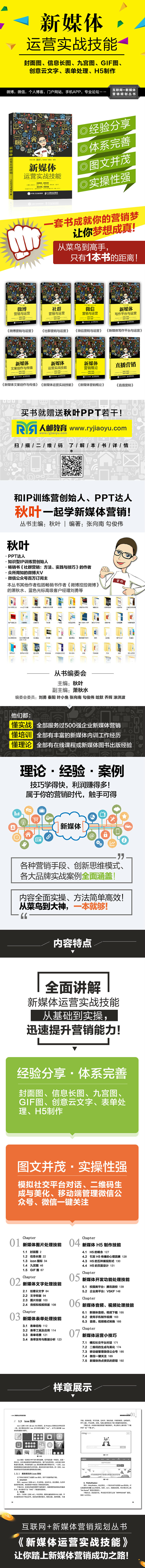 《新媒体运营实战技能》共7章。第1章重点介绍了新媒体图片的创意思路及制作技巧,包括微信公众号封面图、信息长图、icon图标、九宫图、gif图片的具体实战操作;第2章重点介绍了创意云文字、微信排版、滑动看图等新媒体文字的排版方法与处理技巧;第3章是新媒体表单,引导读者对表单结构、设计场景及具体应用全面了解;第4章关于H5的创意思路及制作方法,解析了引发H5传播的心理因素,并重点介绍H5的制作工具与具体使用方法;第5章重点介绍了主流新媒体开发平台,包括第三方管理平台的接入方法、具体功能、微网站与微商城的搭建方法等;第6章关于新媒体音频与视频,主要学习微信朋友圈视频下载方法、聊天语音导出与合并方法、视频与音频格式转换技巧等;第7章选取了新媒体运营中常用的微信对话与朋友圈截图模拟、二维码生成、一键关注页面、热点资讯获取工作,重点学习以上工作的优化技巧与策略。