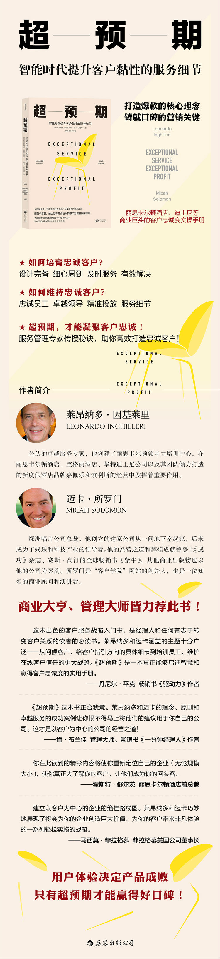 客户至上大家都明白,但做到什么才能践行客户至上?《超预期》里说了四大要素:完美的产品、由细心周到的人提供、及时的服务、有效的问题解决过程。而将服务做到“超预期”最棒的一点,是客户的眼里可以容你的小沙子——他看得到你的好,不那么计较你的坏,甚至能帮助改进。推荐,道理普适的一本书。