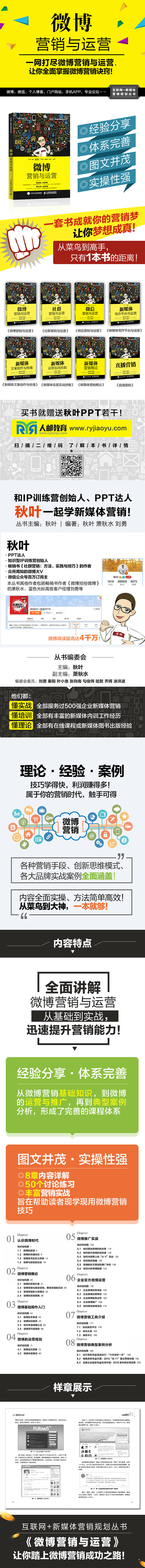 本丛书由PPT达人@秋叶担任主编,@秋叶是知识型IP训练营创始人,畅销书《社群营销:方法、实践与技巧》的作者,也是众所周知的微博大V,微信公众号百万订阅主。本丛书其他作者包括畅销书作者《微博控 控微博》的@萧秋水、蓝色光标高级客户经理刘勇等,他们都: