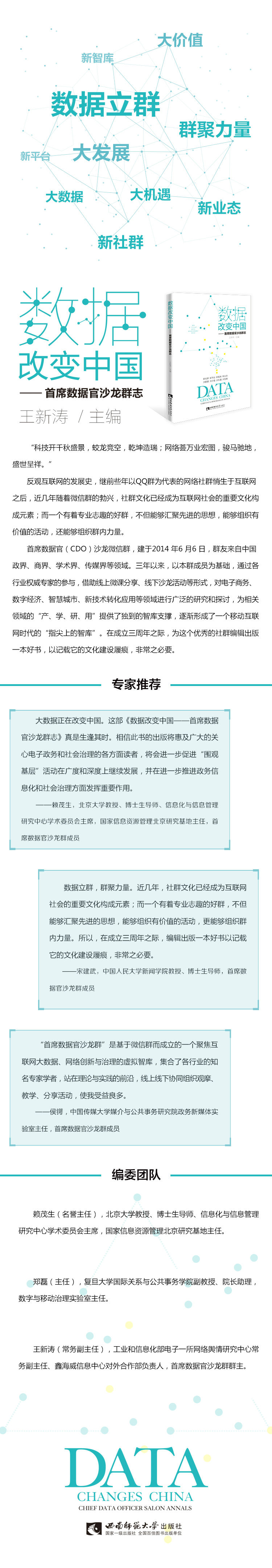 “科技开千秋盛景,蛟龙竞空,乾坤造瑞;网络荟万业宏图,骏马驰地,盛世呈祥。” 反观互联网的发展史,继前些年以QQ群为代表的网络社群悄生于互联网之后,近几年随着微信群的勃兴,社群文化已经成为互联网社会的重要文化构成元素;而一个有着专业志趣的好群,不但能够汇聚先进的思想,能够组织有价值的活动,还能够组织群内力量。首席数据官(CDO)沙龙微信群,建于2014 年6 月6 日,群友来自中国政界、商界、学术界、传媒界等领域。三年以来,以本群成员为基础,通过各行业名家的参与,借助线上微课分享、线下沙龙活动等形式,对电子商务、数字经济、智慧城市、新技术转化应用等领域进行广泛的研究和探讨,为相关领域的“产、学、研、用”提供了独到的智库支撑,逐渐形成了一个移动互联网时代的“指尖上的智库”。所以,在成立三周年之际,为这个优秀的社群编辑出版一本好书,以记载它的文化建设履痕,非常之必要。