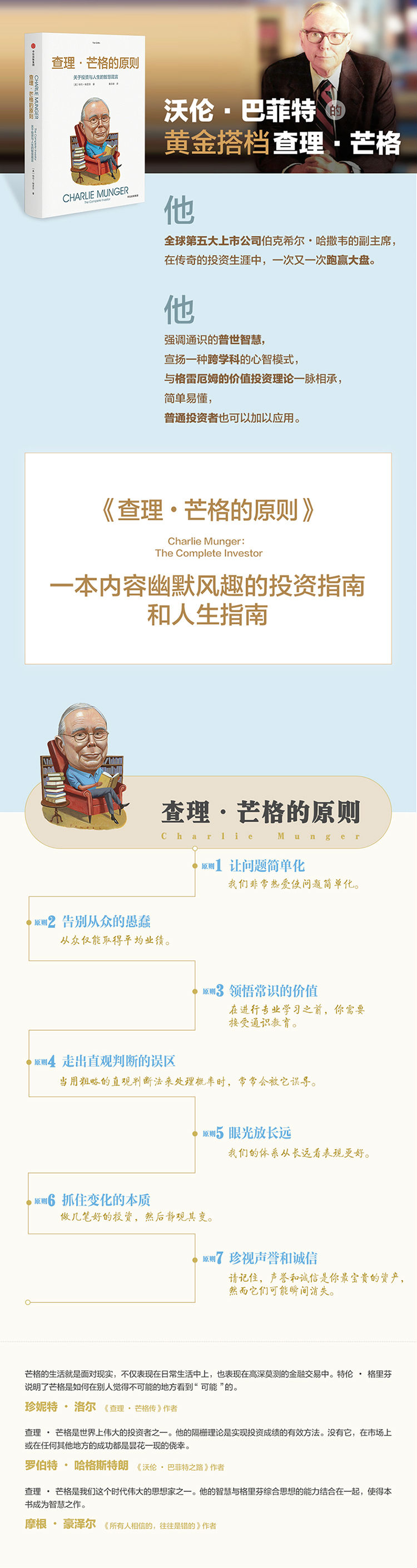 跟沃伦·巴菲特一样,芒格出生于内布拉斯加州的奥马哈市,并在那里长大。他在密歇根大学研读数学,并打算在那里读完大学,获得学位,但这条路因第二次世界大战的爆发而被打断。战争期间,他担任美军的气象学家,并在加州理工学院接受训练。战争结束后,虽然没有本科学历,但他仍然在哈佛大学法学院谋得了一个学习的机会。在加州理工学院受训期间,他喜欢上了加利福尼亚州,从法学院毕业之后,他便与几位合伙人组建了一家律师事务所,后来,这家律师事务所成为全美最有声望的律师事务所之一。尽管法律方面的事业取得了成功,但在沃伦·巴菲特的劝说下,芒格还是很快就离开了律师行业,全职从事投资。事实上,他直到搬到加利福尼亚州的帕萨迪纳居住后才与巴菲特相识。1962—1975年,芒格为一些投资者管理一家合伙企业,年投资回报率接近20%,而同时期道琼斯工业平均指数的回报率还不到5%。芒格不收藏法拉利跑车,也没购买过豪宅。尽管是一位亿万富翁,但在思想或投资之外的很多生活领域,芒格就是一位普通人。