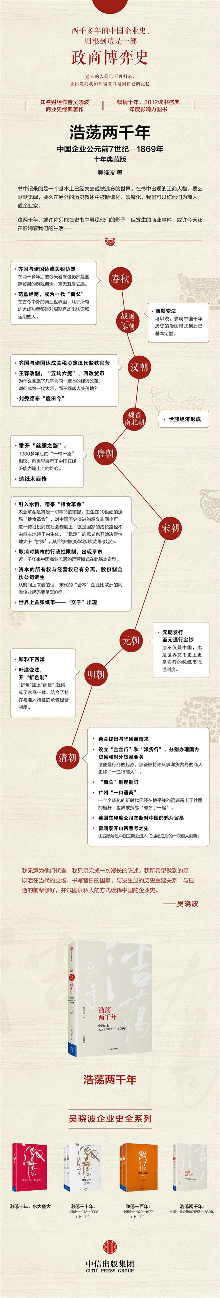 1959年春,时任团中央书记的胡耀邦到河南检查工作。一日,他到南阳卧龙岗武侯祠游览,见殿门两旁悬挂着这样一副对联:“心在朝廷,原无论先主后主;名高天下,何必辨襄阳南阳。”胡耀邦念罢此联后,对陪同人员说:“让我来改一改!”说完,他高声吟诵:“心在人民,原无论大事小事;利归天下,何必争多得少得。” 历史在此刻穿越。两代治国者对朝廷与忠臣、国家与人民的关系进行了不同境界的解读。 中国是世界上文字记录最为完备的国家,也是人口最多、疆域最广、中央集权时间最长的国家之一,如何长治久安,如何保持各个利益集团的均势,是历代治国者日日苦思之事。两千余年来,几乎所有的政治和经济变革均因此而生,而最终形成的制度模型也独步天下。 在过去十年里,我将生命中最好的时间都投注于中国企业历史的梳理与创作。在2004年到2008年,我先是完成并出版《激荡三十年》上、下卷,随后在2009年出版《跌荡一百年》上、下卷,在2011年底出版《浩荡两千年》,在2013年8月出版《历代经济变革得失》,由此,完成了从公元前七世纪“管仲变法”到本轮经济改革的整体叙述。 就在我进行着这一个漫长的写作过程之际,我们的国家又处在一个重要的变革时刻,三十余年的改革开放让它重新回到了世界舞台的中央,而同时,种种的社会矛盾又让每个阶层的人们都有莫名的焦虑感和“受伤感”。 物质充足与精神空虚、经济繁华与贫富悬殊、社会重建与利益博弈,这是一个充满了无限希望和矛盾重重的国家,你无法“离开”,你必须直面。 如果把当代放入两千余年的历史之中进行考察,你会惊讶地发现,正在发生的一切,竟似曾相遇,每一次经济变法,每一个繁华盛世,每一回改朝换代,都可以进行前后的印证和逻辑推导。我们正穿行在一条“历史的三峡”中,它漫长而曲折,沿途风景壮美,险滩时时出现,过往的经验及教训都投影在我们的行动和抉择之中。 我试图从经济变革和企业变迁的角度对正在发生的历史给予一种解释。在这一过程中,我们将一再地追问这些命题,中国的工商文明为什么早慧而晚熟?商人阶层在社会进步中到底扮演了怎样的角色?中国的政商关系为何如此僵硬而对立?市场经济体制最终将以怎样的方式全面建成?在“中国特色”与普世规律之间是否存在斡旋融合的空间? 我的所有写作都是为了一一回答这些事关当代的问题。现在看来,它们有的已部分地找到了答案,有的则还在大雾中徘徊。 我不能保证所有的叙述都是历史“唯一的真相”。所谓的“历史”,其实都是基于事实的“二次建构”,书写者在价值观的支配之下,对事实进行逻辑性的铺陈和编织。我所能保证的是创作的诚意,20世纪60年代的“受难者”顾准在自己的晚年笔记中写道:“我相信,人可以自己解决真善美的全部问题,哪一个问题的解决,也不需乞灵于上帝。”他因此进而说:“历史没有什么可以反对的。”既然如此,那么,我们就必须拒绝任何形式的先验论,必须承认任何一切社会或经济模式的演进,都是多种因素——包括必然和偶然——综合作用的产物。 对于一个国家而言,任何一段历史,都是那个时期的国民的共同抉择。很多人似乎不认同这样的史观,他们常常用“被欺骗”、“被利用”、“被蒙蔽”等字眼来轻易地原谅当时的错误。然而,我更愿意相信易卜生说过的一句话:“每个人对于他所属于的社会都负有责任,那个社会的弊病他也有一份。” 是为总序。