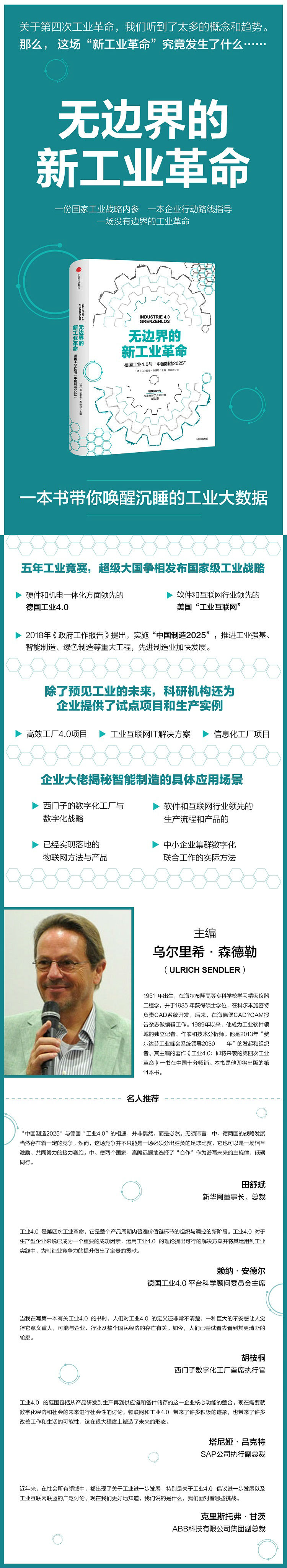这本书的书名“无边界的新工业革命”可能会被夸大理解。也许它会被理解为:一切都是工业4.0,一切都将变得美好!但这是一个完全的误解。这个书名有很多含义,但是准确地说只有一个意义,就是如果用这本书进行市场营销,那不太切合实际,它只是一个夸大的营销标语和关于此事的评论性研究。从出版商的角度出发,少说闲话对大家都有利。