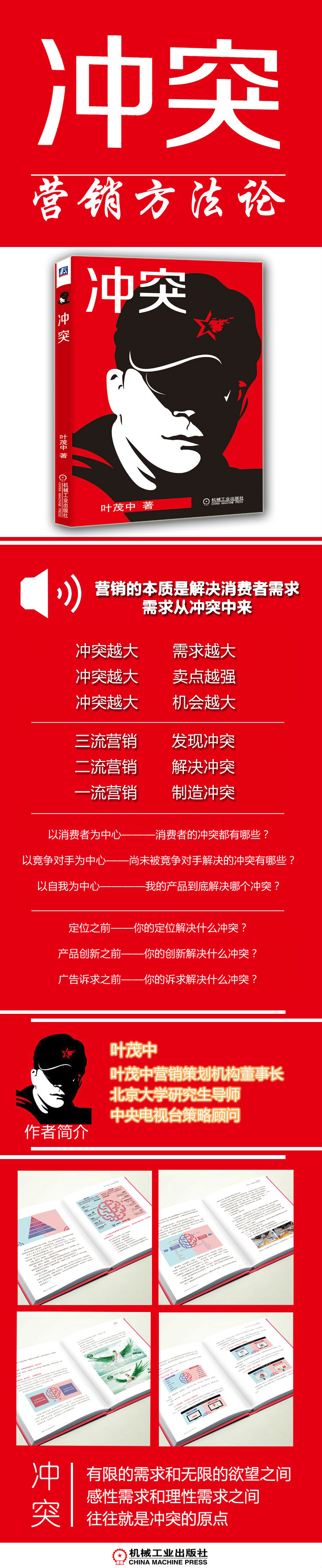 冲突是无处不在的,把冲突研究清楚,实际上就是把市场营销的需求搞清楚了。互联网重新定义了营销,仅仅依靠定位细分市场已经难以获得消费者的认可,利用消费者的冲突进行营销将成为当下营销的重要方法论。本书是叶茂中近三十年的营销心得,它告诉你:在营销越来越失效的时代,如何利用消费者的冲突进行有效的营销。