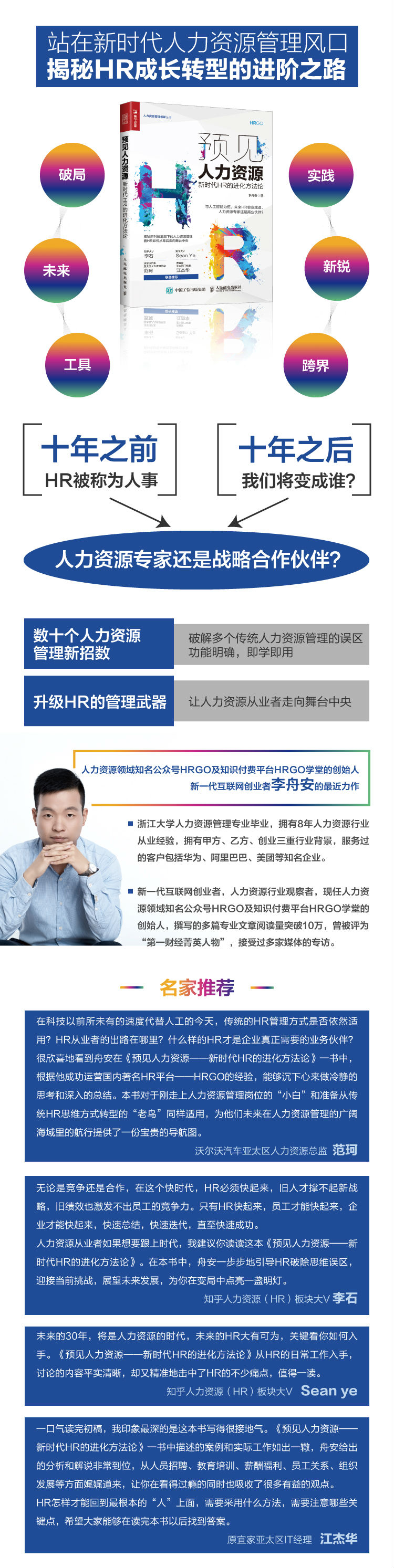 本书作者拥有8 年的人力资源管理工作经验,现在成为了新一代的互联网创业者,他跳出了传统HR 的角色局限,用自己多年的实践经验和对这个行业发展趋势的预判,告诉中国的人力资源从业者,未来十年,HR 要如何转型,如何突破,如何适应新的形势,如何利用新的科技手段,如何成为企业管理者真正的战略协作伙伴,从配角走到舞台中心。