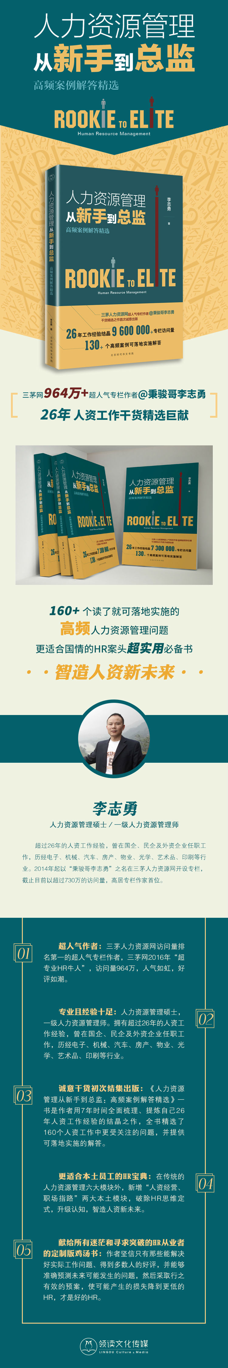 《人力资源管理从新手到总监:高频案例解答精选》一书是三茅人力资源网超人气专栏作者李志勇26年工作经验的全面总结,全书精选了160个人资工作中zui受关注的问题,提供可落地实施的解答,同时也给人某些启迪,带领读者向深层次思考,不唯先,不唯书,逐步树立自己的人资工作思路、做事方法。本书既适合初入职场的人资专业毕业生,也适用于职场中途转入人资领域的同行,同样适用于高校教学时案例讲解,也可供用人单位的人资经理、人资总监或其他中高层管理人士阅读。