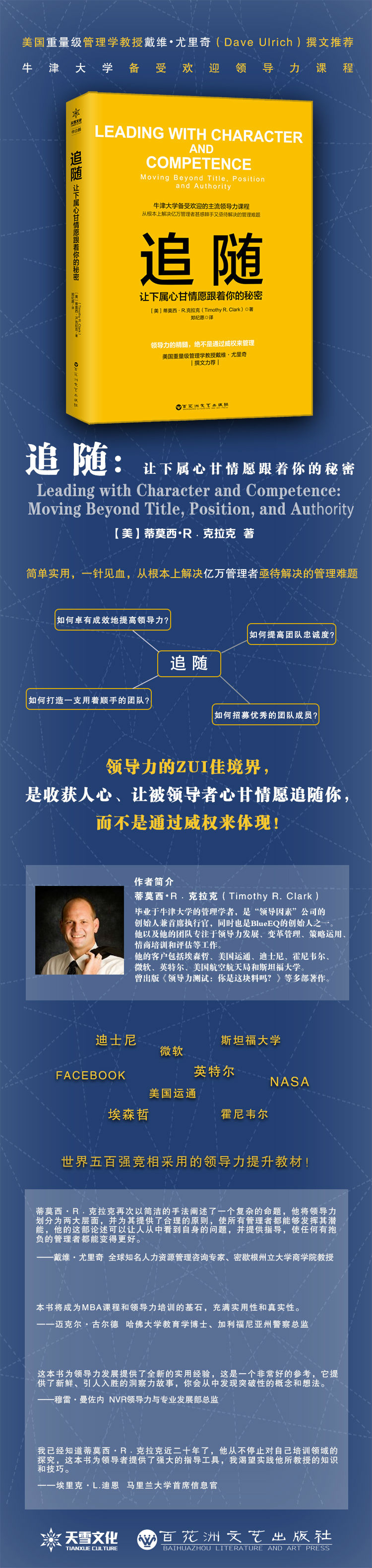 蒂莫西·R﹒克拉克(Timothy R. Clark),毕业于牛津大学的管理学者,是“领导因素”公司的创始人兼首席执行官,同时也是BlueEQ的创始人之一。他以及他的团队专注于领导力发展、变革管理、策略运用、情商培训和评估等工作。他的客户包括埃森哲、美国运通、迪士尼、霍尼韦尔、英特尔、洛克希德?马丁公司、微软、美国航空航天局和斯坦福大学。