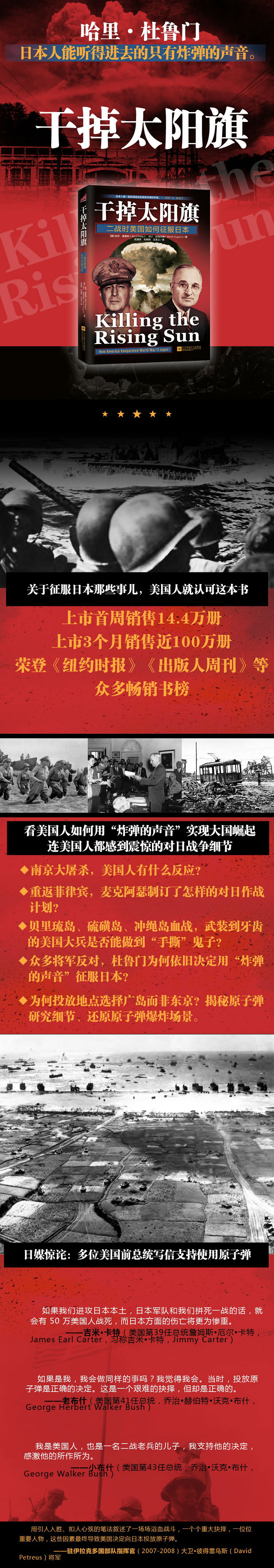 《干掉太阳旗》一书把读者带到血腥的热带岛屿战场贝里琉岛和硫磺岛,带到战火纷飞的菲律宾——道格拉斯·麦克阿瑟将军凯旋而归并精心策划全面进攻日本本土方案的地方。