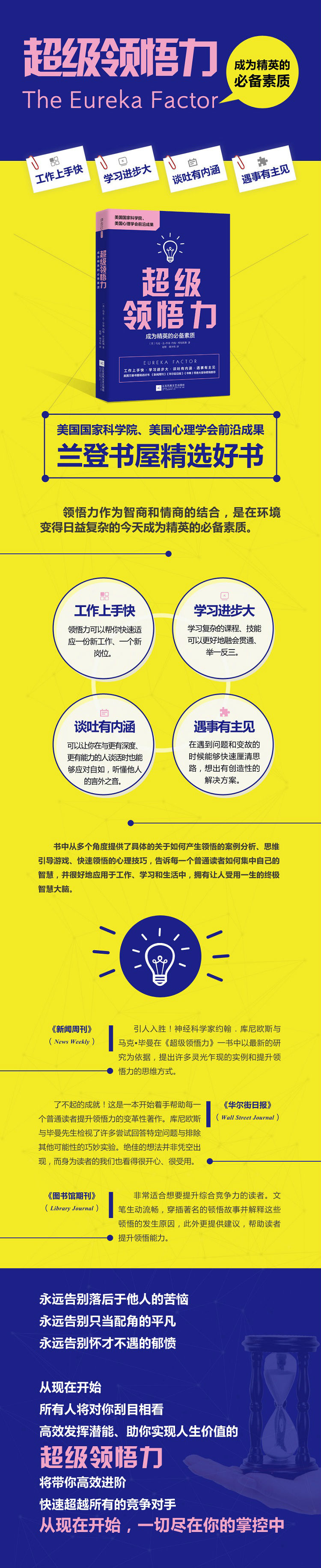美国国家科学院研究员,美国心理学会研究员,从事心理学、神经科学研究二十余年的杰出心理学家马克??毕曼和约翰??库尼欧斯的调研表明,人的领悟力是我们生活经验的一部分,是一种心理技巧,是可以后天培养出来的。这种心理技巧能拓宽我们对世界的看法以及对我们自身认知的深度,并可以提高我们对生活中事情的掌控力。