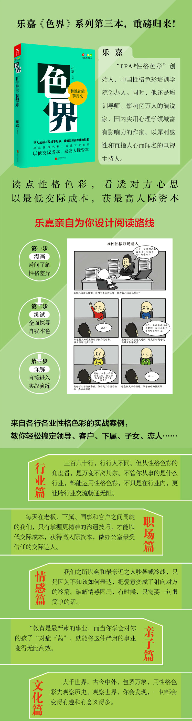 弹指一挥间,离“色界创刊号”《色界:活得舒坦并不难》出版到现在,《色界》书系已经到第三本了。当初决定主编这套应用书系时,我遭遇了很多质疑和反对的声音,因为此前我的所有图书都只有一个主题,只有我一个人写。那时读者只知道乐嘉在做性格色彩,并不知道在我身后,还有一个庞大的色友群体,他们都是热衷于学习、研究与分享性格色彩的人。《色界》书系的每本书都由若干个不同职业背景、不同特长与研究领域、不同性格与写作方式的作者,每人贡献一篇关于在自己的领域应用性格色彩的文章,形成一本合集。当我决定要出这样一套书的时候,很多熟悉我、关心我的朋友提出了疑问:“这样一本书,不懂性格色彩的人能看懂吗?”“懂性格色彩的人,会希望看到自己关心的一个领域的诸多文章,但未必会有兴趣看到一本包罗万象的合集吧?”