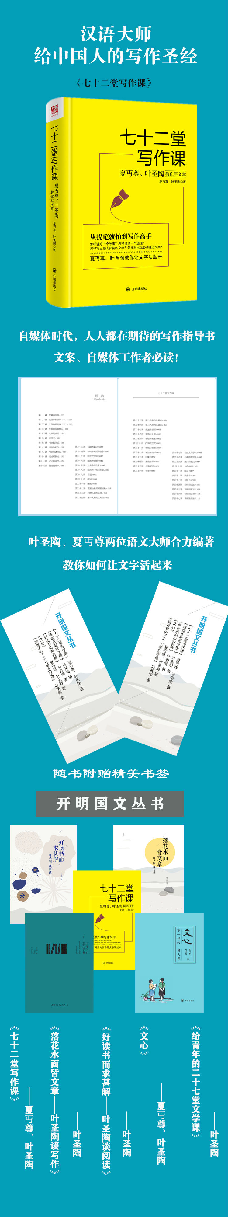 开明出版社现将七十二篇“文话”抽出来,汇编成这本《七十二堂写作课——夏丏尊、叶圣陶教你写文章》,生动而形象地告诉我们作文是一门科学,贵在创新,但“作文”又有共性,具有共同的规律可循。读者朋友一旦分享了这七十二篇“文话”,写作的思路就会豁然开朗,写作的兴趣和悟性也会得到拓展和升华。