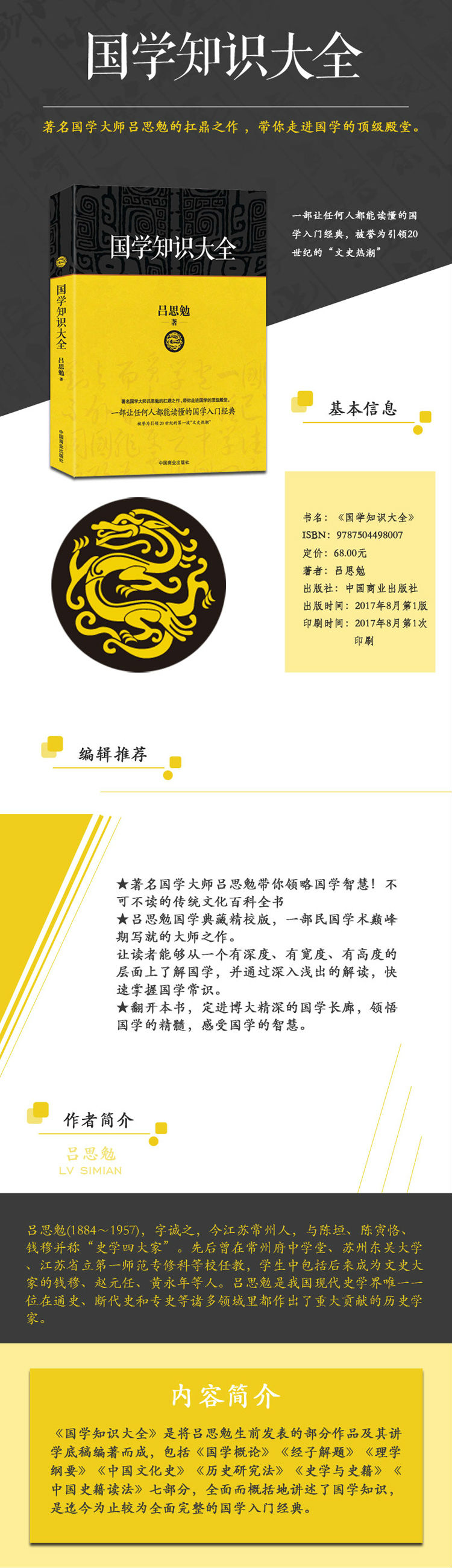 《国学知识大全》是将吕思勉生前发表的部分作品以及其讲学底稿编著而成,包括《国学概论》《经子解题》《理学纲要》《中国文化史》《历史研究法》《史学与史籍》《中国史籍读法》七部分,全面而概括地讲述了国学知识,是迄今为止较为全面完整的国学入门经典。