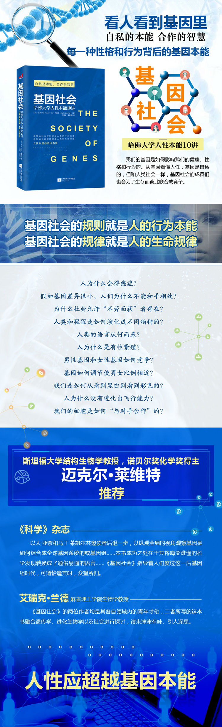 《基因社会》由哈佛大学学者依据近年研究撰写,哈佛大学出版社出版,讲述你的基因如何掌控你的身体、性格和生活。