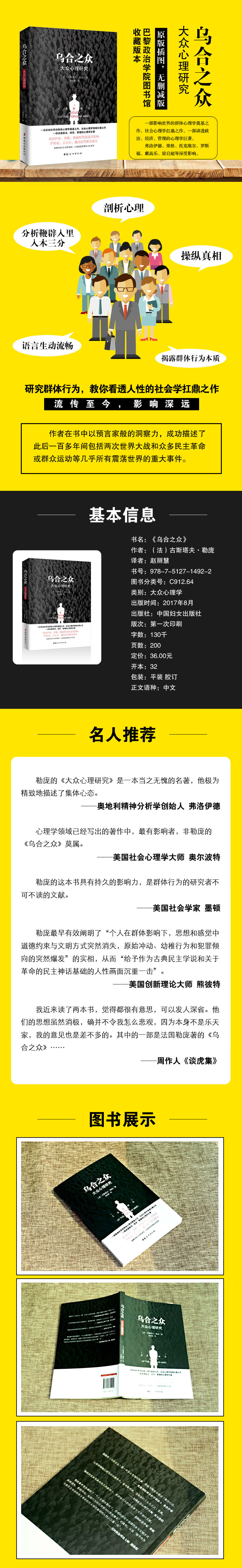《乌合之众》是法国著名社会心理学家古斯塔夫.勒庞的重要著作,该书首次出版于1895年,迄今已有一百多年的历史,被誉为大众心理学的开山之作。该书深入浅出地剖析了群体的种种特点及其成因,精致地描述了集体心态,对人们理解集体行为的作用以及对社会心理学的思考发挥了巨大影响。作者在书中以预言家般的洞察力,成功描述了此后一百多年间包括两次世界大战和众多民主革命或群众运动等几乎所有震荡世界的重大事件。本书深刻影响了弗洛伊德、荣格、托克维尔等学者以及罗斯福、丘吉尔、戴高乐等政治人物,至今仍在国际学术界有广泛影响,是群体行为研究者的必读经典。