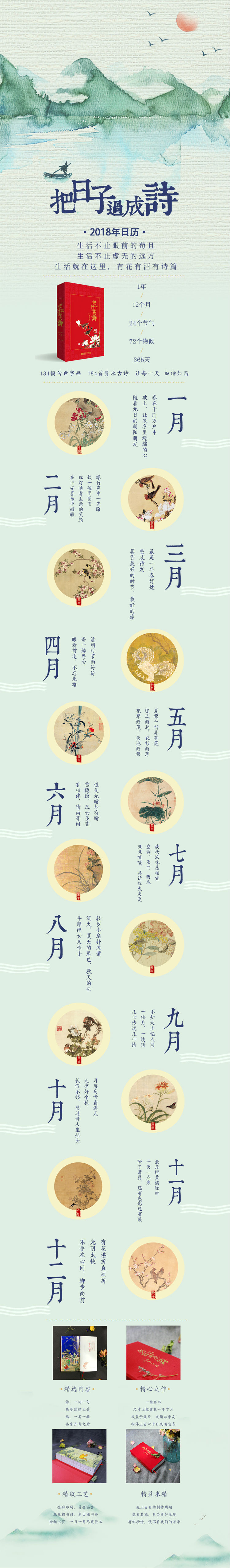 古诗词是中华民族珍贵的文学宝库,其中的名篇佳句千百年来为人们传诵,已经成为我们的文化根脉,融入了国人的日常生活。《把日子过成诗—2018年日历》按照节气、物候、风俗……选取相关古诗,并选配中国历代绘画,读者可以在读诗赏画中,具体而微地体会诗之美,把日子过成诗。