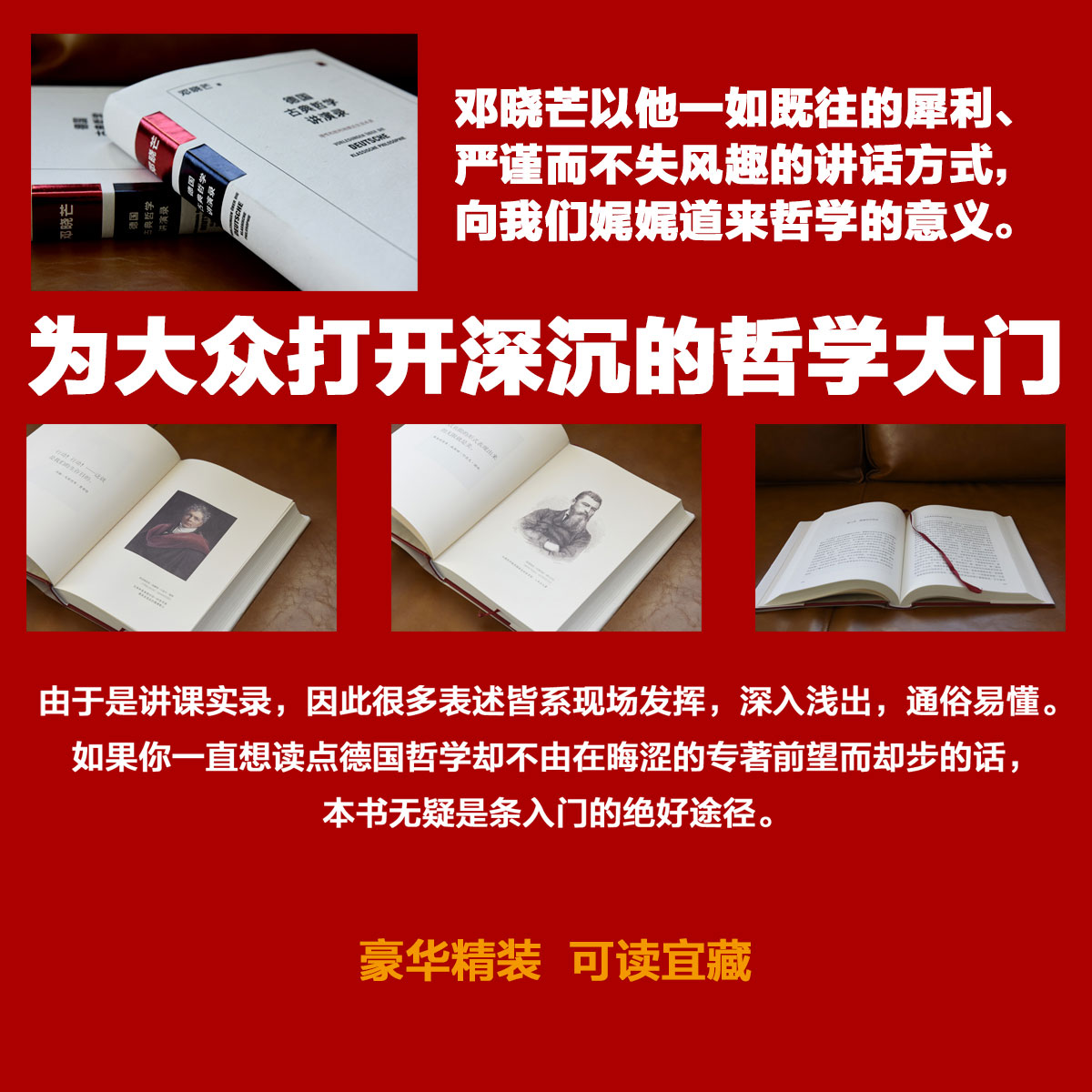 本书是由哲学家邓晓芒先生为武汉大学哲学系本科生开设的“德国古典哲学课”的讲课录音整理而成的。作者的重点是讲康德和黑格尔,对于费希特、谢林、费尔巴哈一众哲学大牛也略有涉及。《德国古典哲学讲演录》的宗旨不是艰深的学术研究,而是旨在还原德国哲学的概貌,进而为大众打开沉重的哲学大门。由于是讲课实录,因此很多表述皆系现场发挥,深入浅出,通俗易懂。如果你一直想读点德国哲学却不由在晦涩的专著前望而却步的话,本书无疑是条入门的绝好途径。