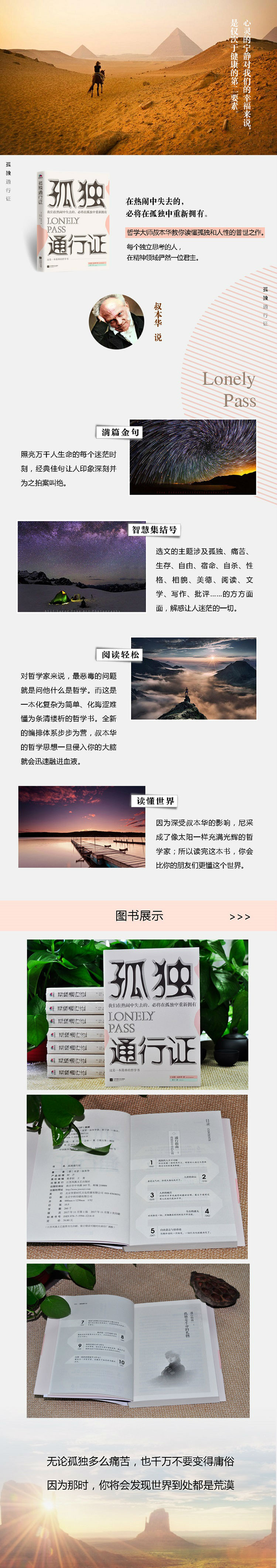 (1)我们的孤独就像天空中漂浮的城市,仿佛是一个秘密,却无从述说。这本书替你将孤独的本质娓娓道来,读完你会更智慧地处理群体与个人的关系。