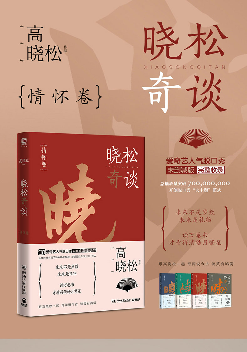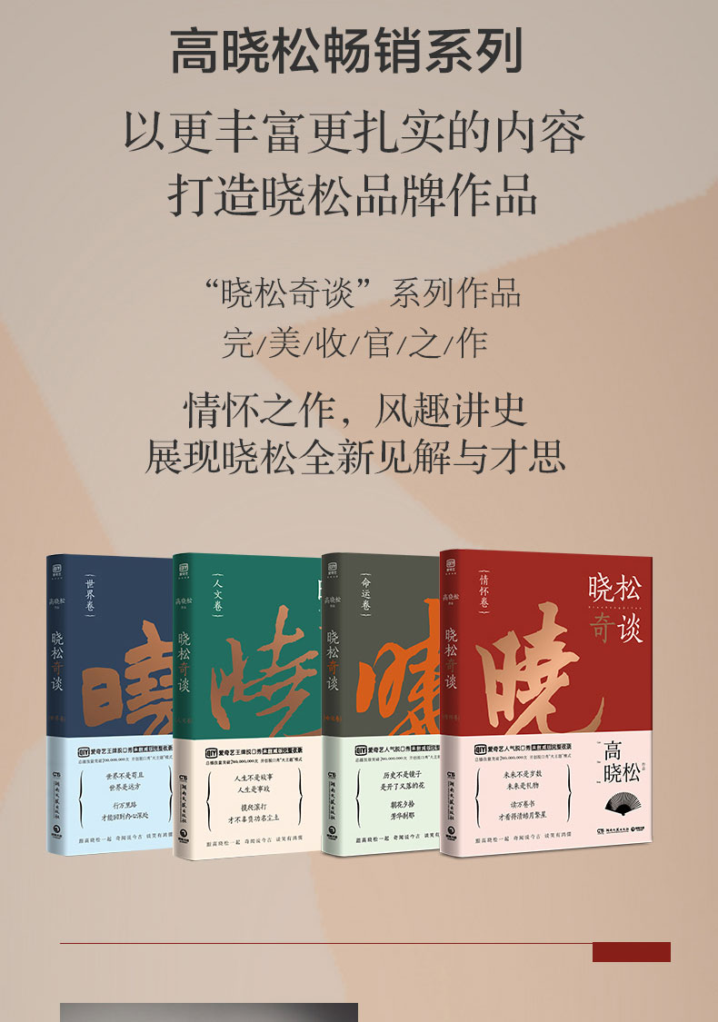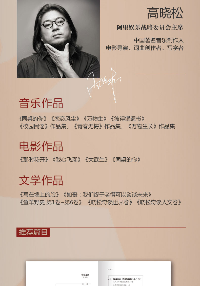 ★高晓松,“文青翘楚、浪子班头”,音乐、影视、文艺 三栖才子,新浪微博粉丝超四千万。“晓松奇谈”系列之人文卷、世界卷销量已过50万册,“鱼羊野史”系列总销量已过200万册。