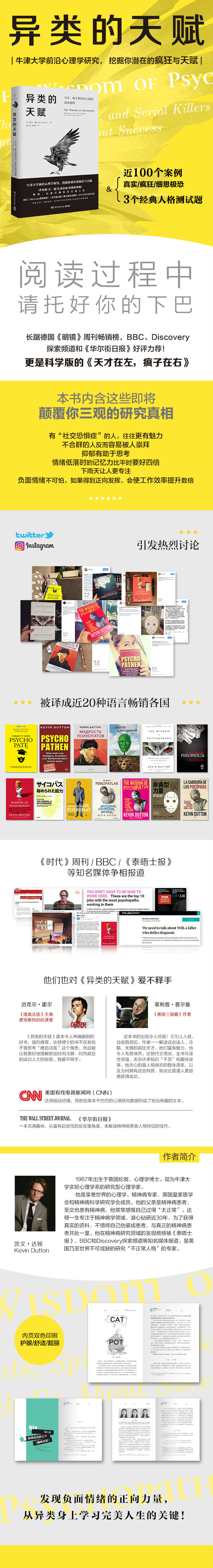 凯文.达顿(Kevin Dutton),1967年出生于英国伦敦,心理学博士。现为牛津大学实验心理学系的研究型心理学家。他是享誉世界的心理学、精神病专家,英国皇家医学会和精神病科学研究学会成员。他的父亲是精神病患者,至交也患有精神病,他常常感慨自己过得“太正常”。达顿一生专注于精神病学领域,潜心钻研近30年,为了获得真实的资料,不惜将自己伪装成患者,与真正的精神病患者共处一室。他在精神病研究领域的发现频频被《泰晤士报》、BBC和Discovery探索频道等知名媒体报道,是英国乃至世界不可或缺的研究“不正常人格”的专家。