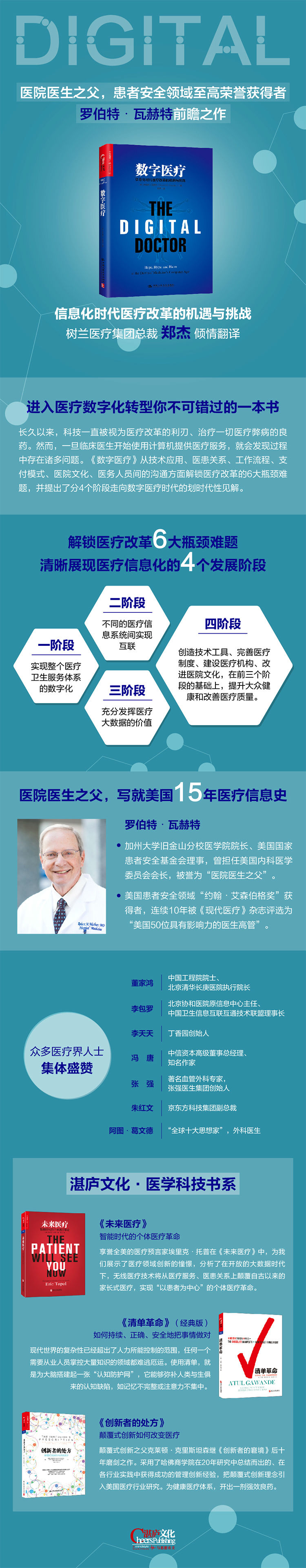 那么什么才是真正意义上的数字医疗,医疗改革的成功之路又在哪里?《数字医疗》从技术应用、医患关系、工作流程、支付模式、医院文化、医务人员间的沟通方面解锁医疗改革的6大瓶颈难题,为医疗安全保驾护航,并提出了分4个阶段走向数字医疗时代的划时代性见解。