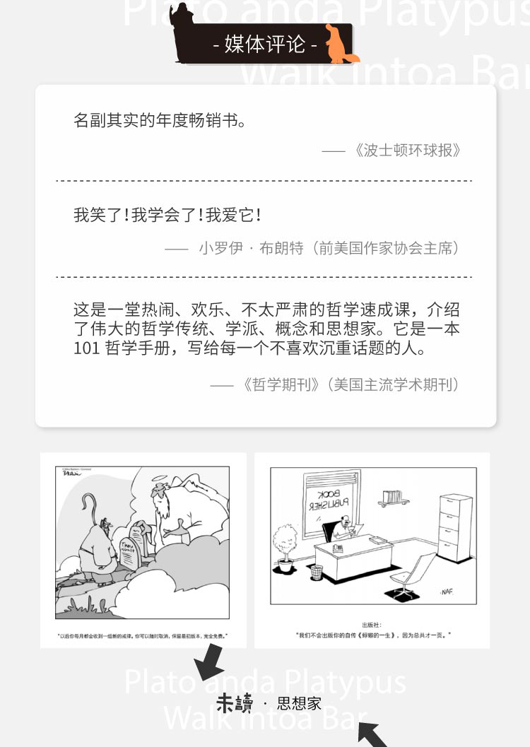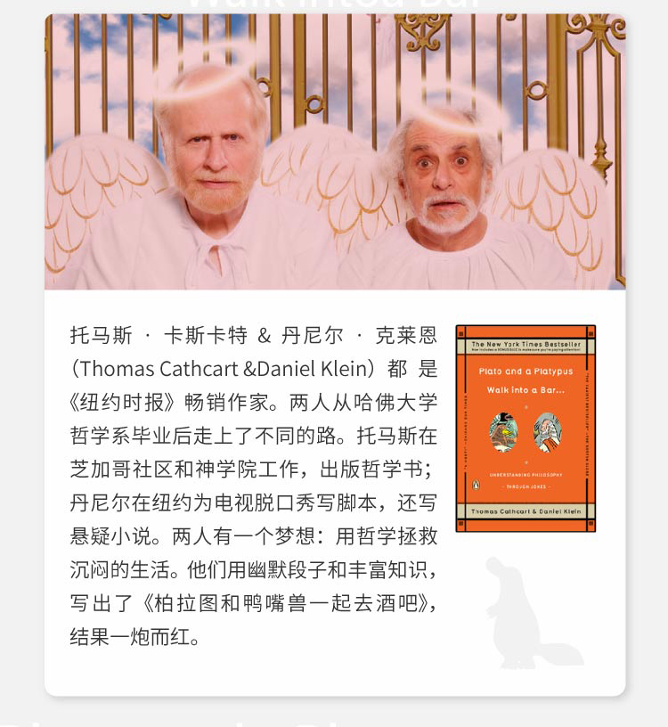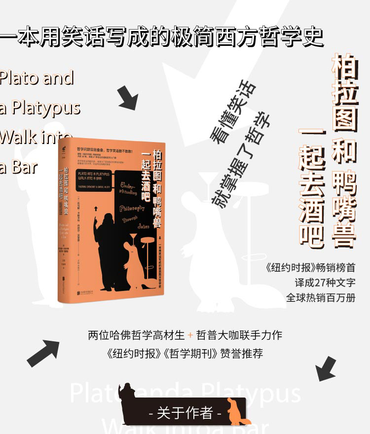 托马斯·卡斯卡特&丹尼尔·克莱恩(Thomas Cathcart &Daniel Klein),美国畅销作家。两人从哈佛大学哲学系毕业后走上了不同的路。托马斯在芝加哥社区和神学院工作,出版哲学书;丹尼尔在纽约为电视脱口秀写脚本,还写悬疑小说。两人有一个梦想:用哲学拯救沉闷的生活。他们用幽默段子和丰富知识,写出了《柏拉图和鸭嘴兽一起去酒吧》,结果一炮而红。他们目前都和家人生活在新英格兰地区。