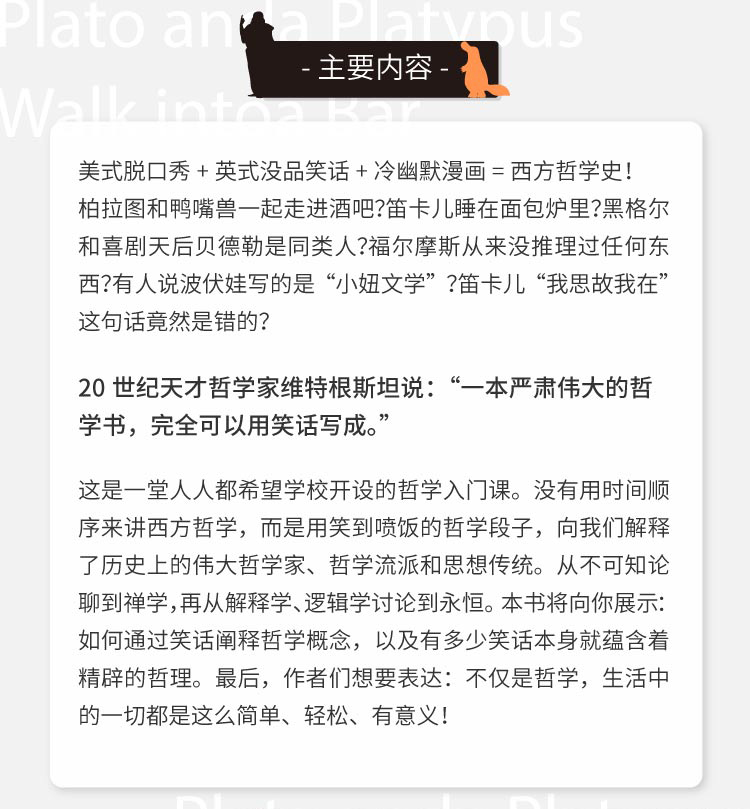 用笑话直戳哲学的本质,按哲学流派,按从问题到问题的逻辑写作。每个问题用几则笑话来解释,配上一张冷幽默漫画。还有大量哲学家八卦:柏拉图和鸭嘴兽一起走进酒吧?笛卡儿睡在面包炉里?黑格尔和美国喜剧天后是同类?福尔摩斯从没推理过任何东西?有人说波伏娃写的是“小妞文学”?“我思故我在”这句话竟然是错的?