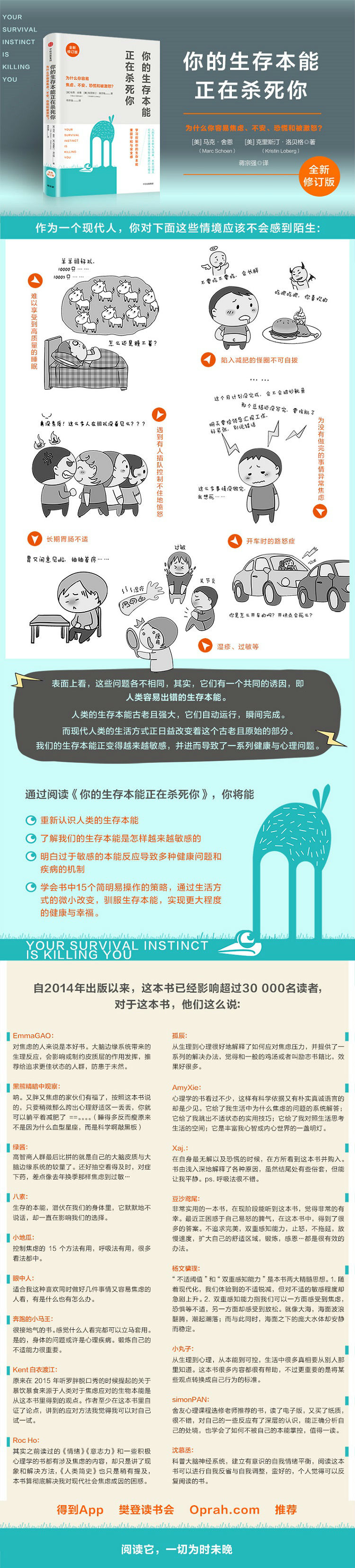 推荐三:得到app、樊登读书会、Oprah.com推荐,心身医学、压力管理专家马克?舍恩结合脑科学、心理学、认知科学等方面的知识,分析了人类对不适的耐受力与古老且强大的生存本能之间的联系,并给出了15个简单实用的策略,帮助你管理舒适区,保持沉着和冷静。经过练习,你会发现自己对不适的忍耐能力远超你的想象。