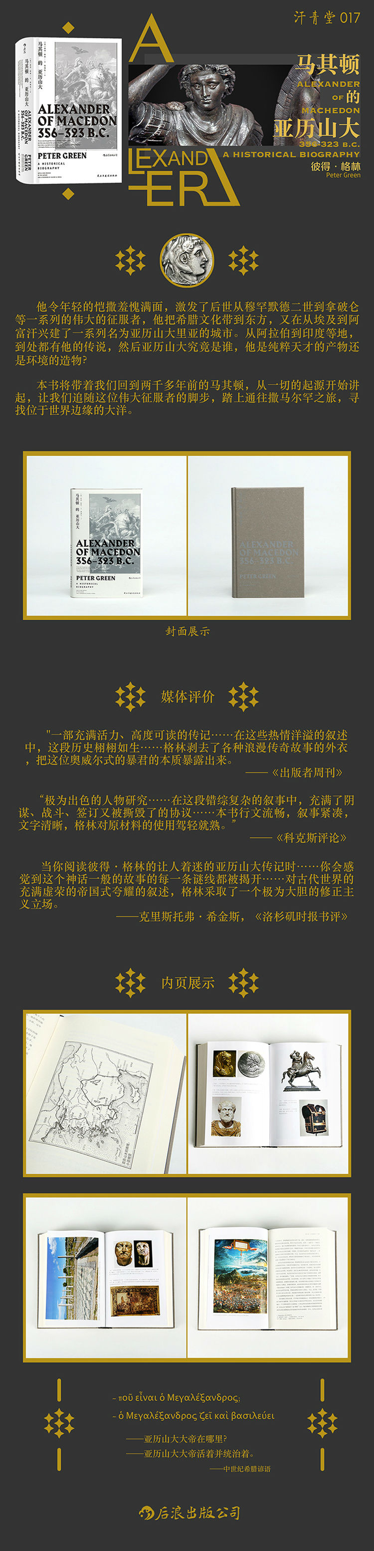[英]彼得·格林(1924-)是德克萨斯大学奥斯汀分校古典学荣休教授,曾任爱荷华大学古典学兼职教授。著作有《从亚历山大到亚克兴》(Alexander to Actium)、《希腊化时代简史》(The Hellenistic Age: A Short History)、《亚历山大与希腊化时代》(Alexander The Great and the Hellenistic Age)等,译著有《卡图卢斯诗歌集》(The Poems of Catullus)、《伊利亚特》(The Iliad)、《奥德赛》(The Odyssey)等。