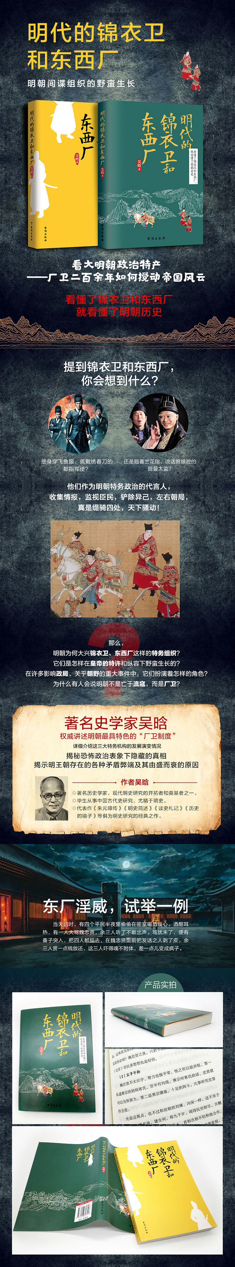 在旧式的政体之下,与被统治的人民相比,皇帝的地位非但不孤立,反而是永远处于危险的边缘,尊严的神圣宝座下,时刻酝酿着待爆发的火山。为了维护自己的统治,他们不得不想尽镇压的法子,公开的刑律、军校、法庭不够用,也不便用,他们还需要造成恐怖空气的特种组织、特种监狱和特种侦探,来监视每一个可疑的人。而在明代,执行这些特殊任务的特种组织就是锦衣卫和东西厂。