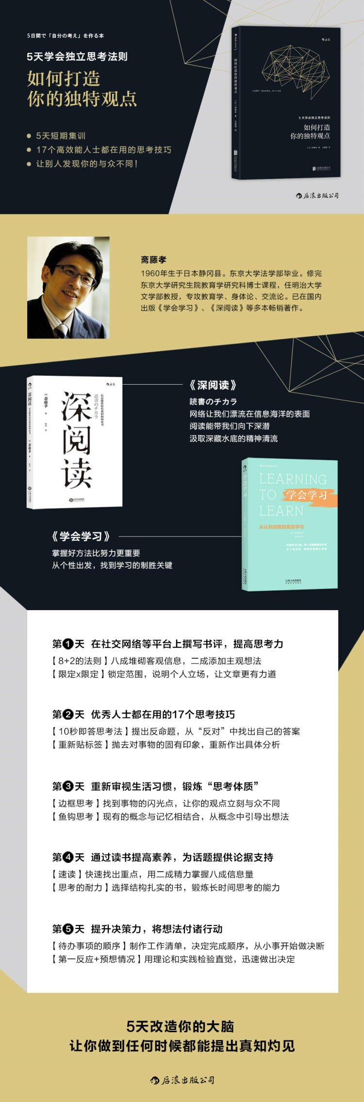 作者提出的“5天短期集训”的方式,能够在短期内快速提升你的独立思考能力。比如,多写书评,培养思考的感觉;审视生活习惯,打造“思考体质”;多读书,给自己的想法找依据……在短短的5天内改造你的大脑,让你做到任何时候都能提出真知灼见,不会再说“没意见”。