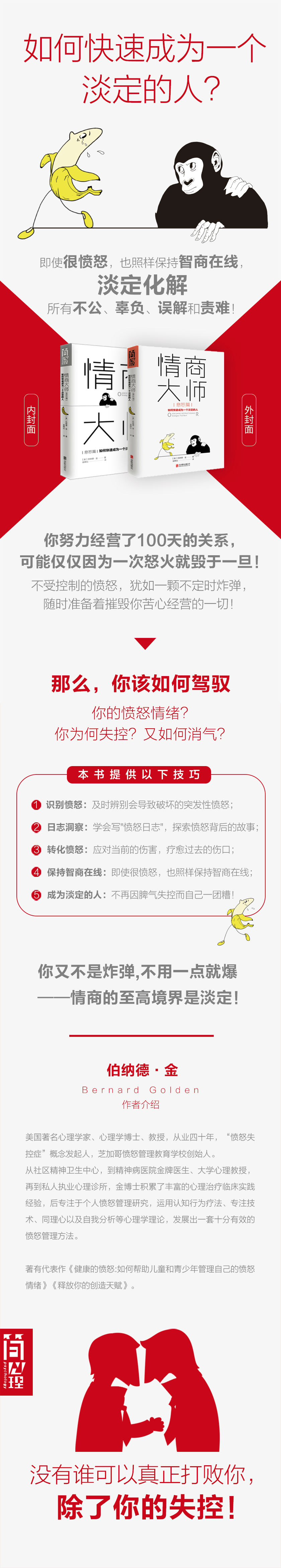 心理学家的伯纳德?金也曾是愤怒失控症的受害者。他潜心研究人类的愤怒情绪20年,根植于认知行为疗法,辅以共情、习惯转移、自我分析等方式,发展出一套高情商自助练习法,将破坏性愤怒转化为健康的愤怒!