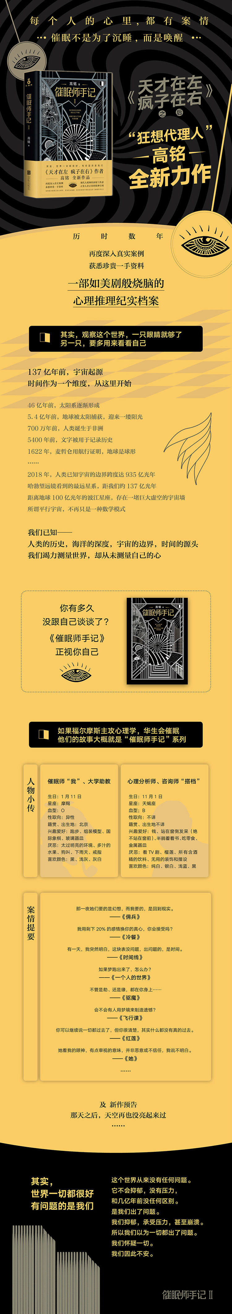 继《天才在左 疯子在右》之后,狂想代理人高铭再度发力,历时数年,深入催眠、心理诊所,接触真实案例,获悉珍贵一手资料,探寻人心深处潜藏的秘密,直面现代人精神的困境与煎熬,写成“催眠师手记”系列,打造一部如美剧般精彩的心理推理纪实档案。