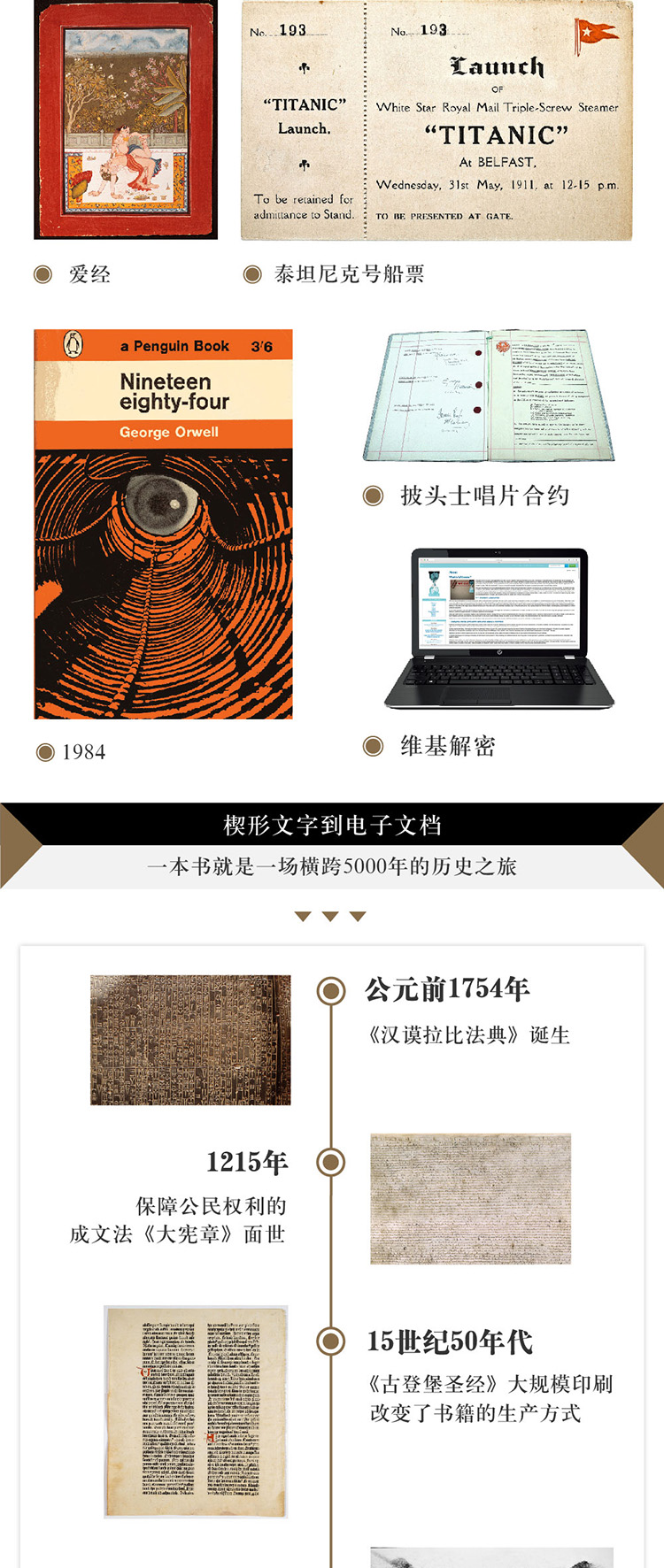从牛顿手稿到阿波罗登月计划,从留声机专利证书到披头士唱片合约,从“泰坦尼克”号沉没电报到安妮日记,从第*张照片到第*个网站,人类的每一次进步、每一个错误、每一场欢欣鼓舞、每一回悲伤哀恸,都凝结在一份份无声的文件中。历史长河里,这些文件背后的“光辉”*越了时间与空间,激发宗教热情、推动科技发展、创造文化潮流,最终塑造了我们的世界。