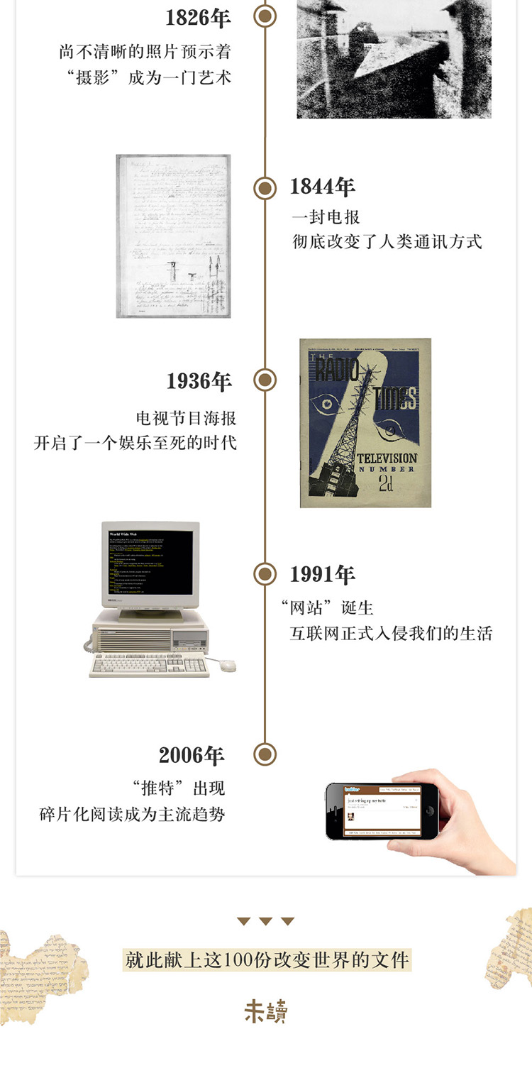 本书也收录了一些影响了大众文化和现代媒介的标志性文件——披头士乐队与EMI唱片公司的合约,最早的电视节目单,苹果公司创立时的相关文件,还有第一个网站,第一条推特。