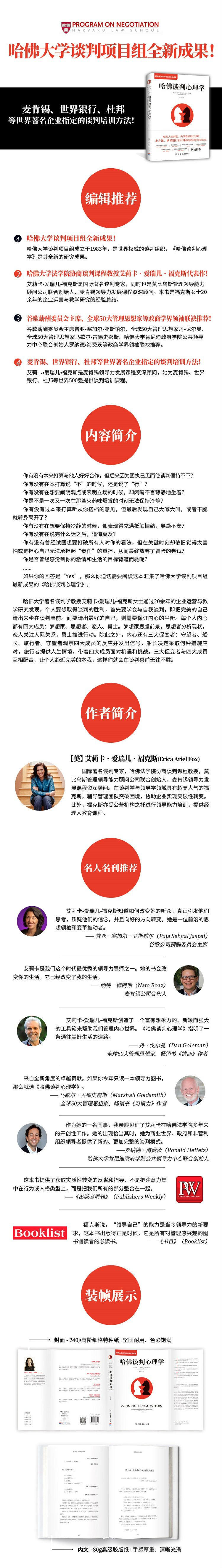 第一本是具有里程碑意义的《谈判力》(Getting to Yes: Negotiating Agreement Without Giving In),它预示了“双赢”协作时代的来临,推出了谈判的“哈佛理念”,作者教导我们“分开人与事”。