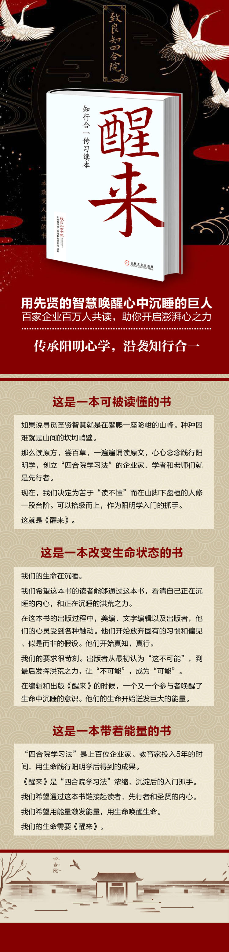 致良知四合院成立的目的是,打造一个开放的学习和实践平台,践行阳明心学,传播阳明心学,让阳明心学成为中华民族伟大复兴的强劲心动力。