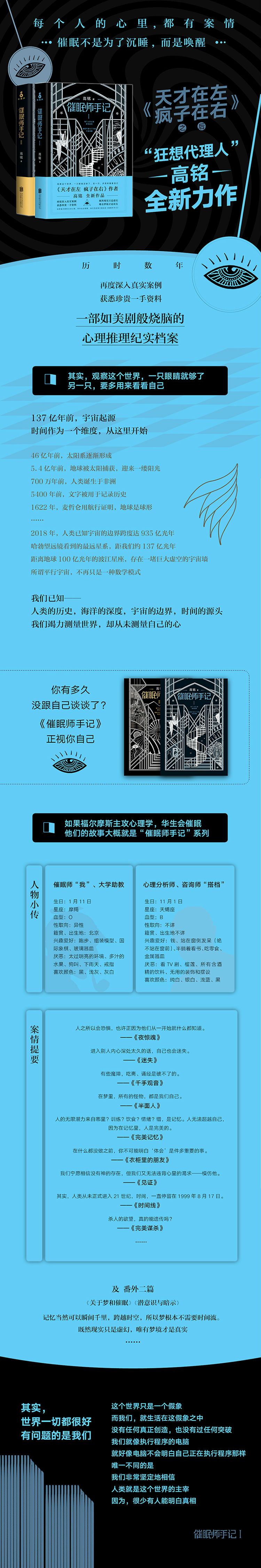 观察这个世界,一只眼睛足够了,另一只,多用来看看自己。继《天才在左 疯子在右》之后,狂想代理人高铭再度发力,历时数年,深入催眠、心理诊所,接触真实案例,获悉珍贵一手资料,探寻人心深处潜藏的秘密,直面现代人精神的困境与煎熬,写成“催眠师手记”系列,打造一部如美剧般精彩的心理推理纪实档案。
