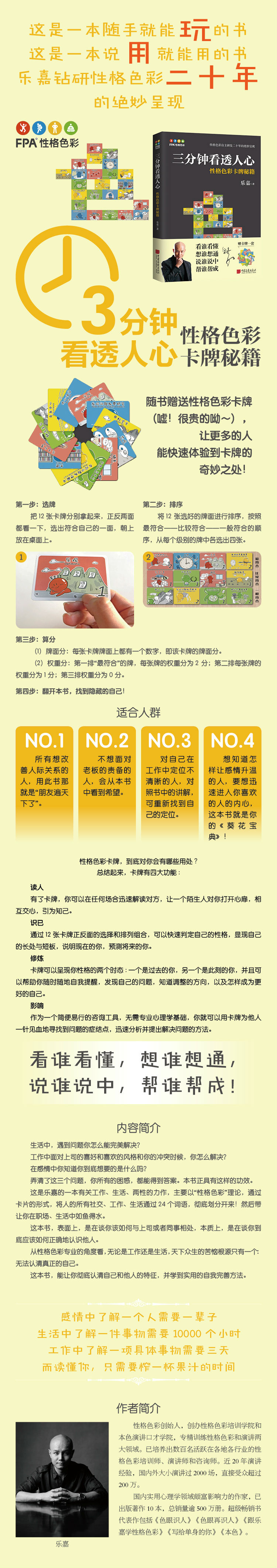 这是乐嘉的一本“性格色彩”工作、生活、两性的力作,主要以“性格色彩”理论,通过卡片的形式,