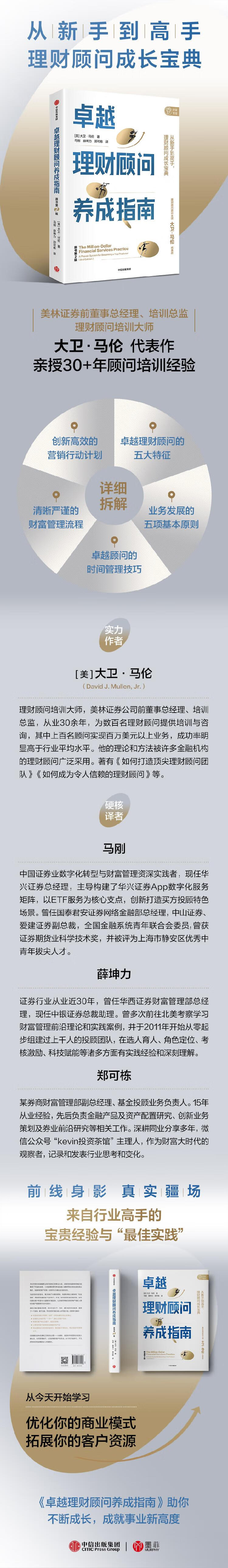 《卓越理财顾问养成指南》覆盖理财顾问从客户尽调到客户服务工作的方方面面。无论你处于职业生涯的哪个阶段, 它都会为你提供实用的工具, 帮助你成就收入百万美元甚至百万美元以上的金融服务业务。本书提供的工具包括模板、话术、社交行动计划、清单列表、任务、营销计划、信件和各类资源, 每种工具都被整合到整套方法中。本书会告诉你什么时候使用它们、如何使用它们以及使用它们的频率。我在书中提到的技巧, 在32 年的时间里让理财顾问受益匪浅。无论你是在大公司工作, 还是独自运营着自己的事业, 你都可以从本书中获益。