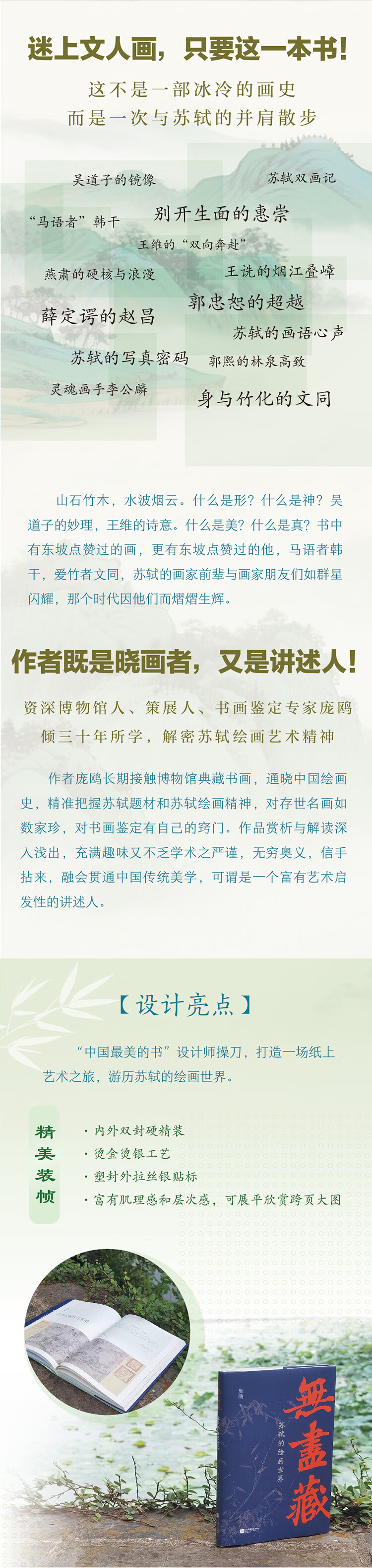 “中国最美的书”设计师操刀,打造一场纸上艺术之旅,游历苏轼的绘画世界。内外双封硬精装,护封用棉纸印刷+烫银工艺,内封用草绿色艺术纸印刷+烫金工艺,内页用高克重全涂层艺术纸呈现。全书6种纸张变换,富有肌理感和层次,手感舒适,实现艺术和工艺上的美好衔接,绘画作品高清还原。塑封外拉丝银贴标不伤图书质感,方便阅读。南京爱德承印,8色机UV油墨全彩印刷,精装图书品质保证。