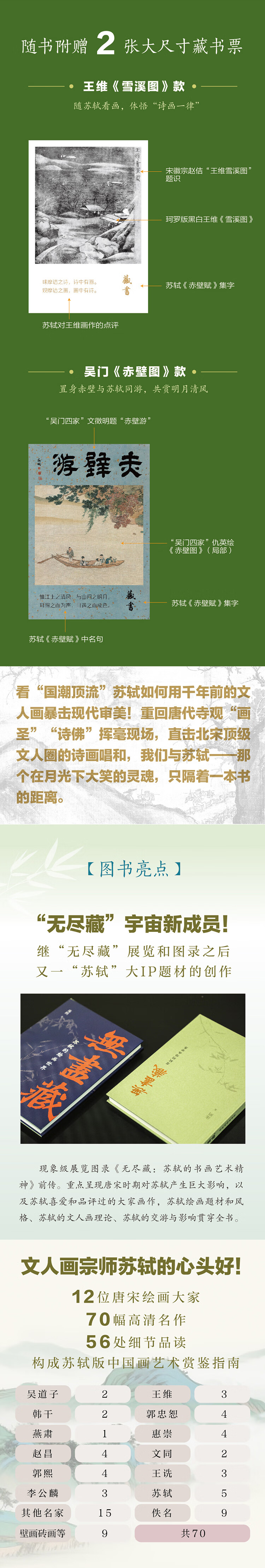 书名沿用“无尽藏”,取自苏轼名篇《赤壁赋》,其意为,苏轼的绘画精神如同大自然的馈赠,是后世艺术创作者无穷尽的宝藏。